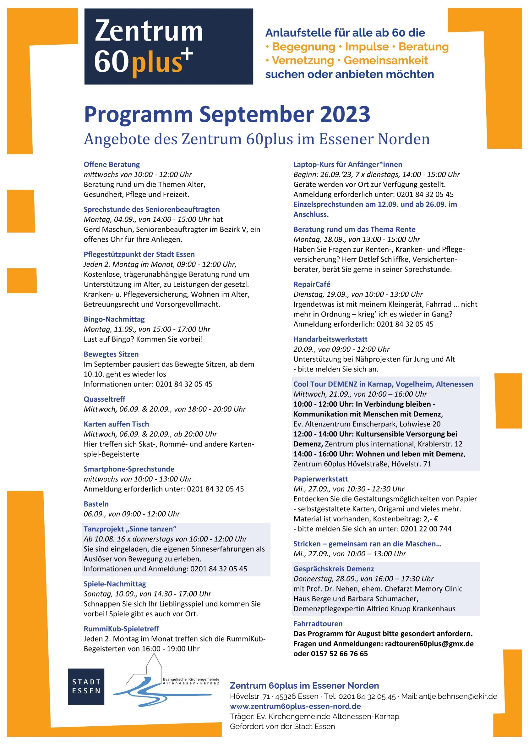 Die Kontaktdaten für Anmeldungen oder Rückfragen entnehmen Sie bitte dem aktuellen Programm: Programm Zentrum 60plus Dezember